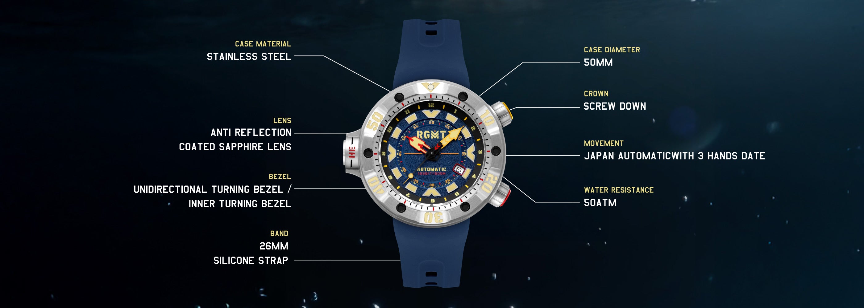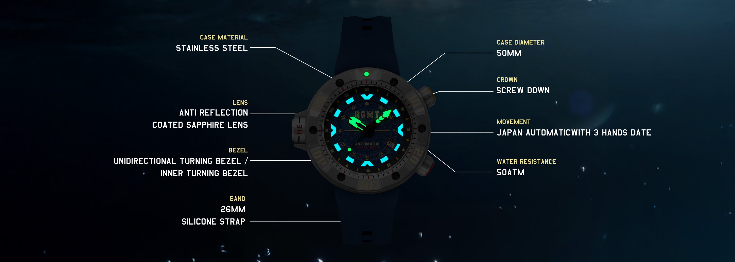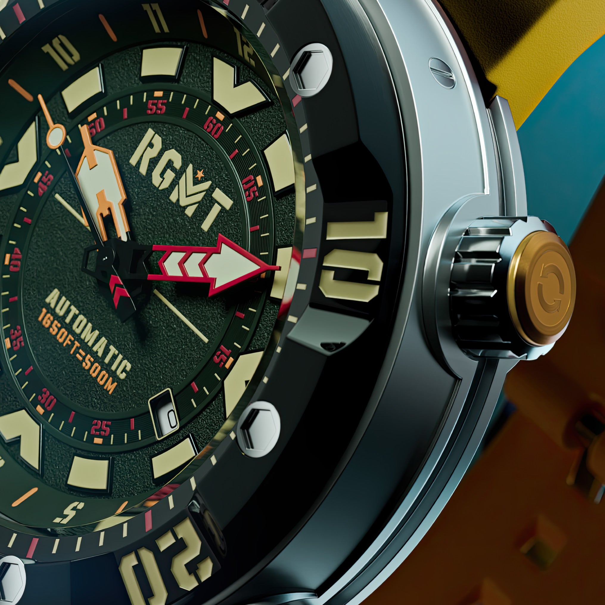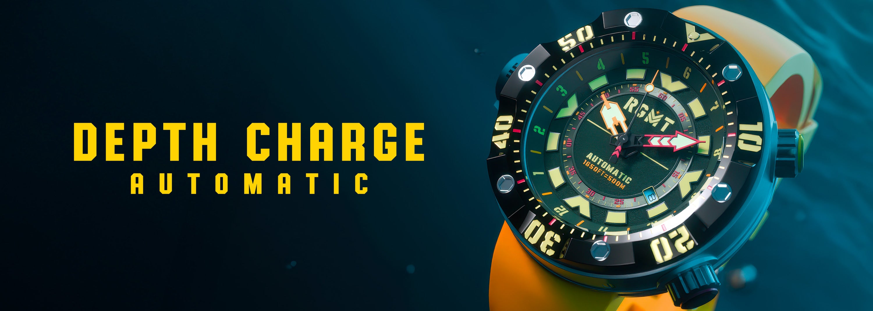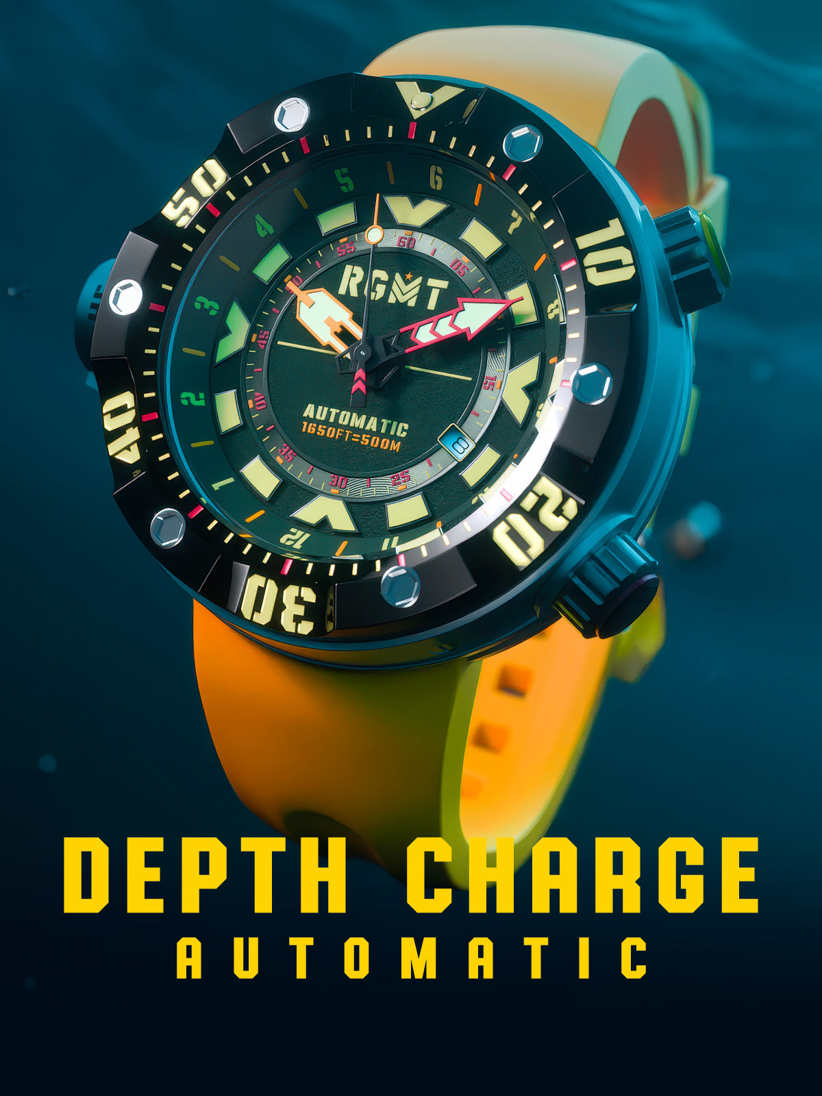 Introducing the Depth Charge Automatic, engineered for operations far beneath the surface. Rated for 50 ATM, reinforced with Japan Automatic power, and built with a pressure-proof structure, this is the dive watch designed to go where visibility fades and the mission intensifies.