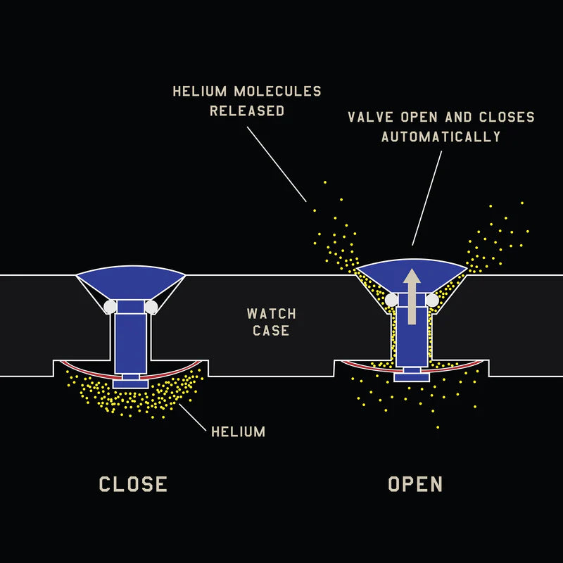The automatic helium release valve does not need any manual intervention or adjustment. Gas can automatically disperse from the case through the spring-actuated valve on the side of the watch. As pressure from expanding helium builds inside the watchcase, the valve opens up just enough to emit the helium from the watch, making the watch safe to use in any deep-sea condition.