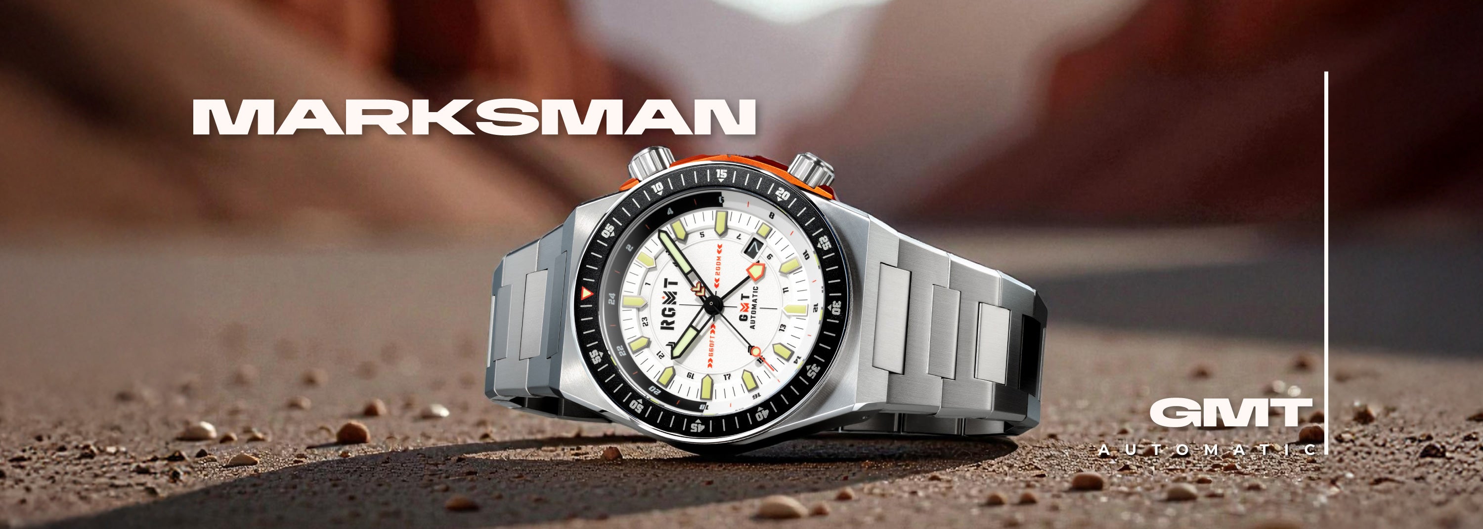 The Marksman GMT Automatic delivers tactical precision in every environment. Designed for those who move between time zones and missions, its dual-time GMT function keeps you connected wherever the mission takes you.