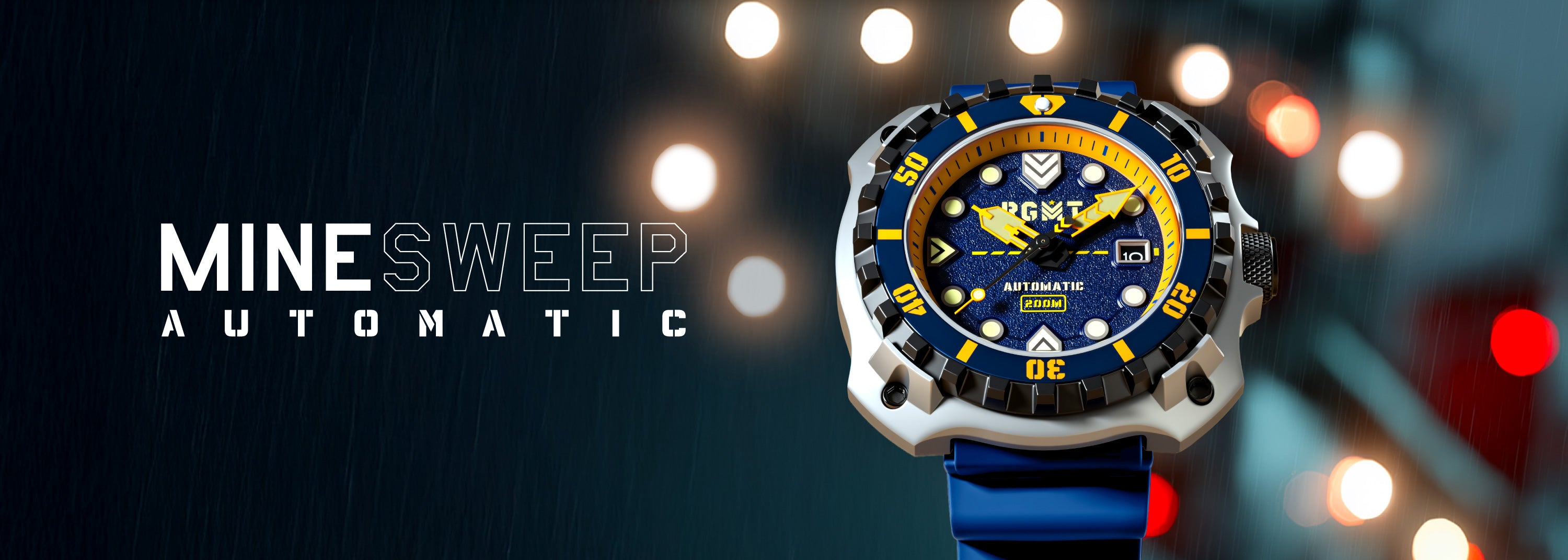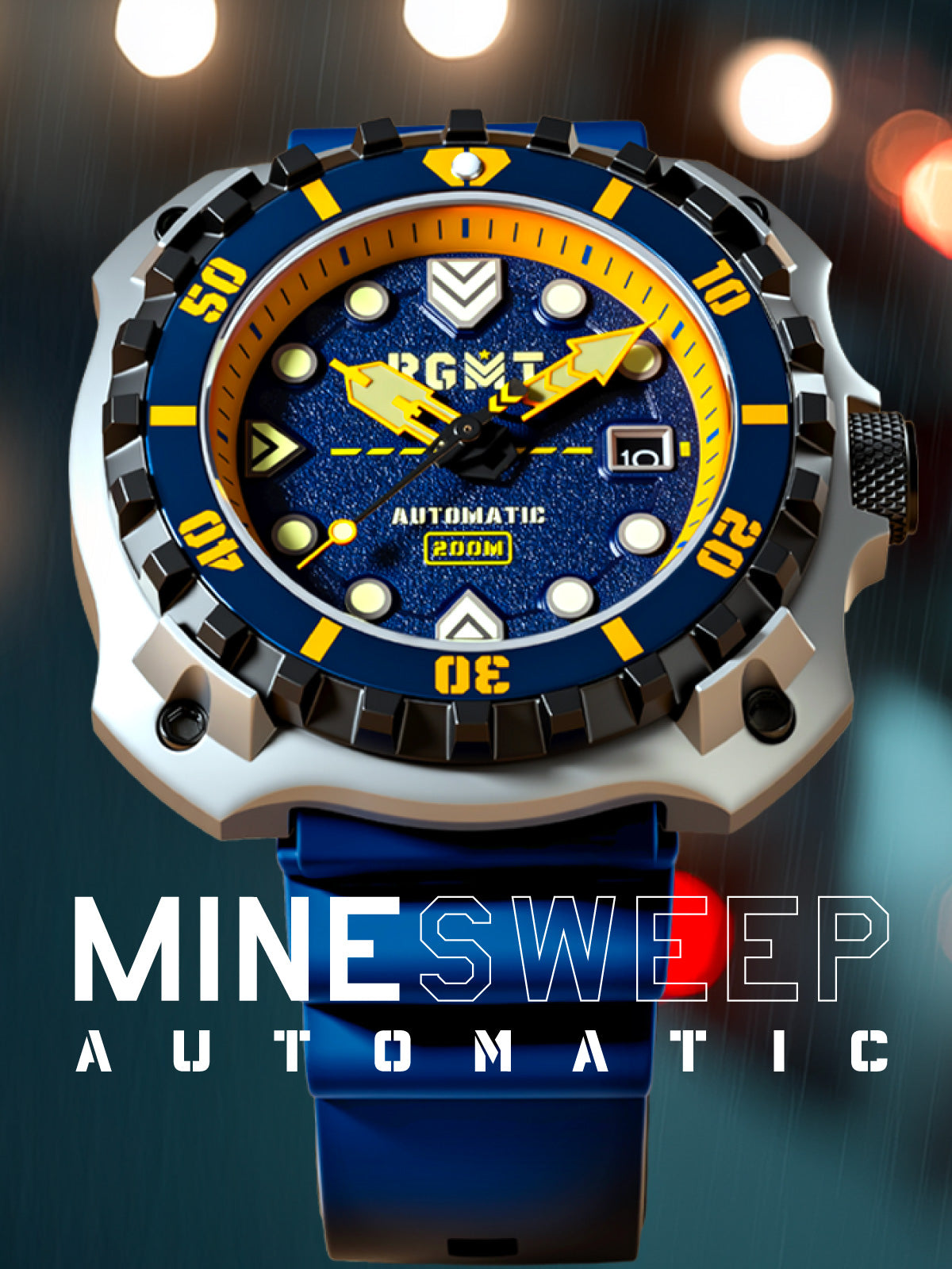 Introducing the Minesweep Automatic, crafted from solid stainless steel with an aluminum-plated unidirectional bezel, sapphire lens, and Swiss lume that commands the dark.