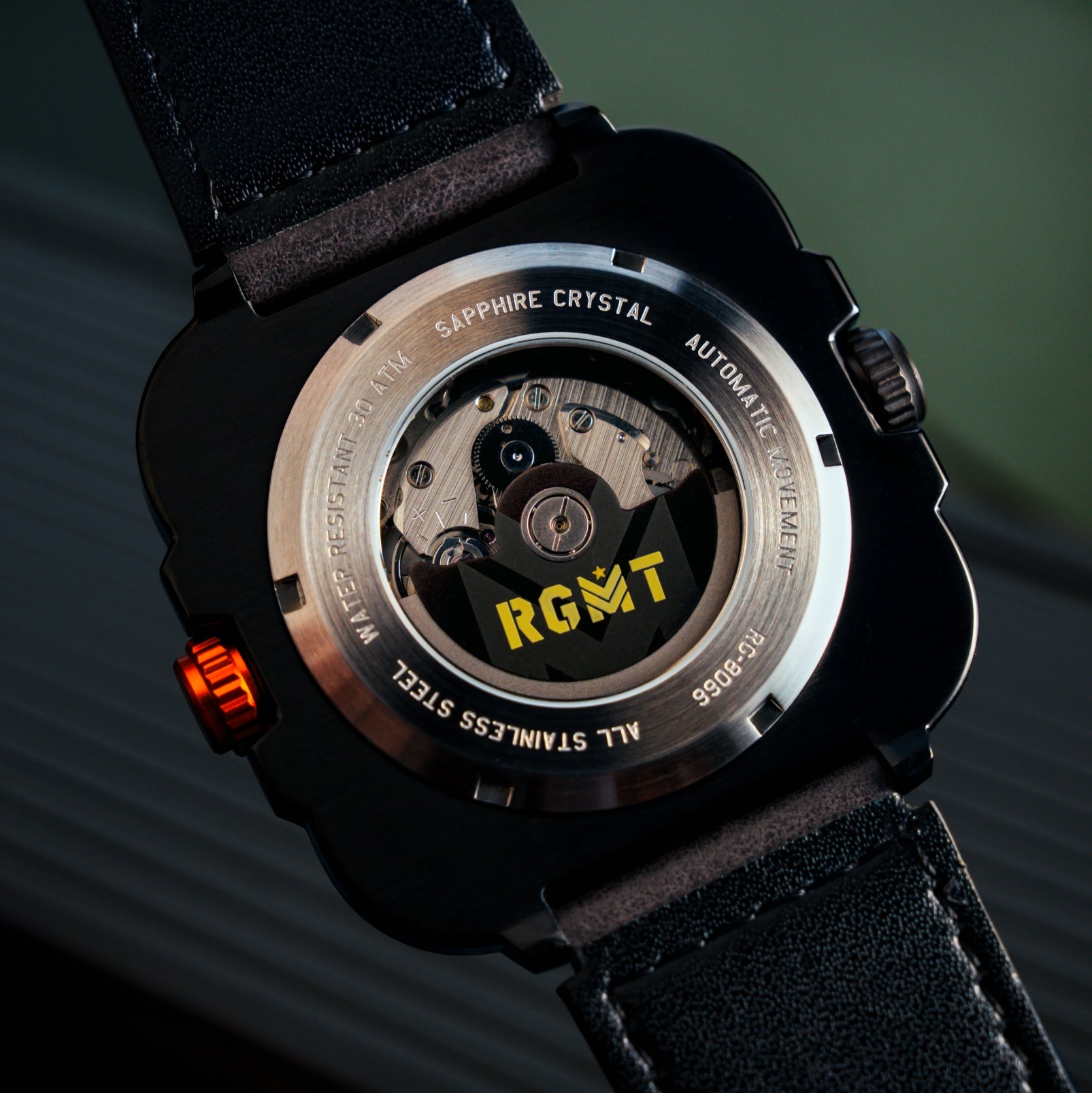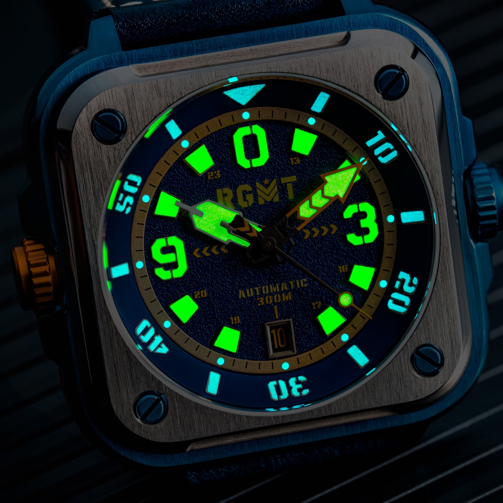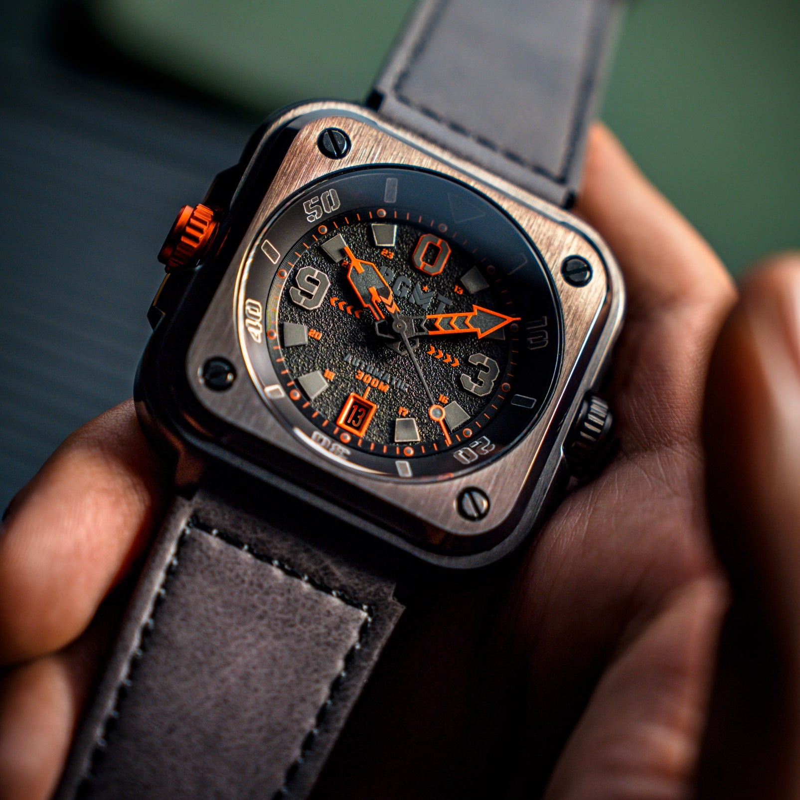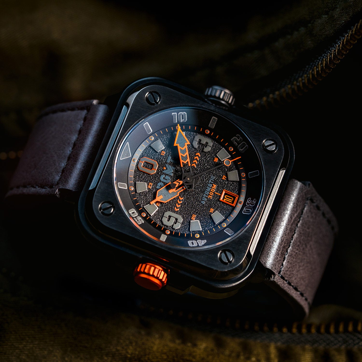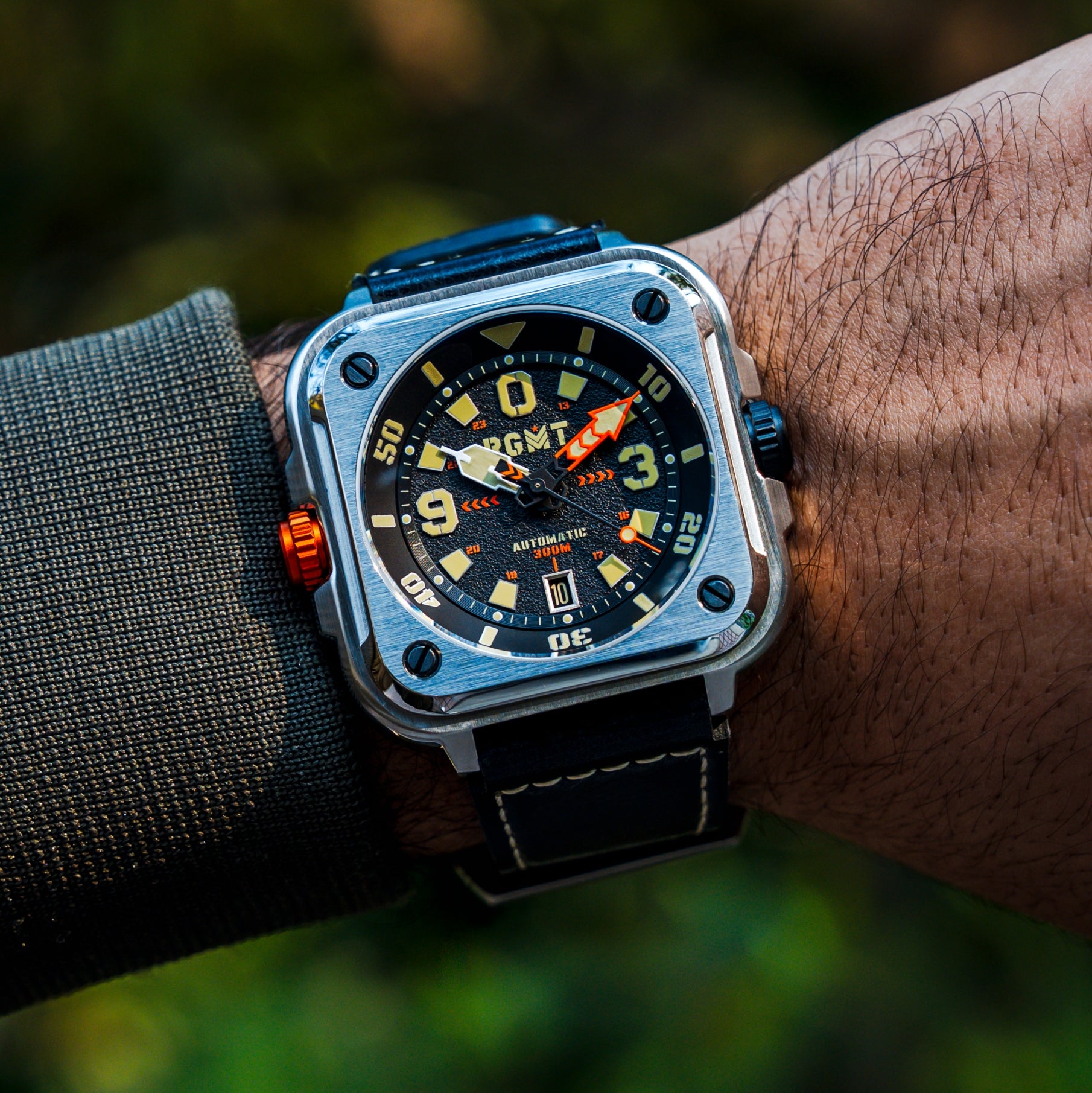 The Pershing Automatic is crafted for those who thrive in the toughest conditions. Featuring a 50mm stainless-steel square case and sapphire crystal lens with anti-reflective coating, this watch ensures maximum protection and clarity in any environment. Powered by a precision automatic movement with three-hand date function, it offers uncompromising accuracy, while 30 ATM water resistance guarantees performance under extreme pressure.