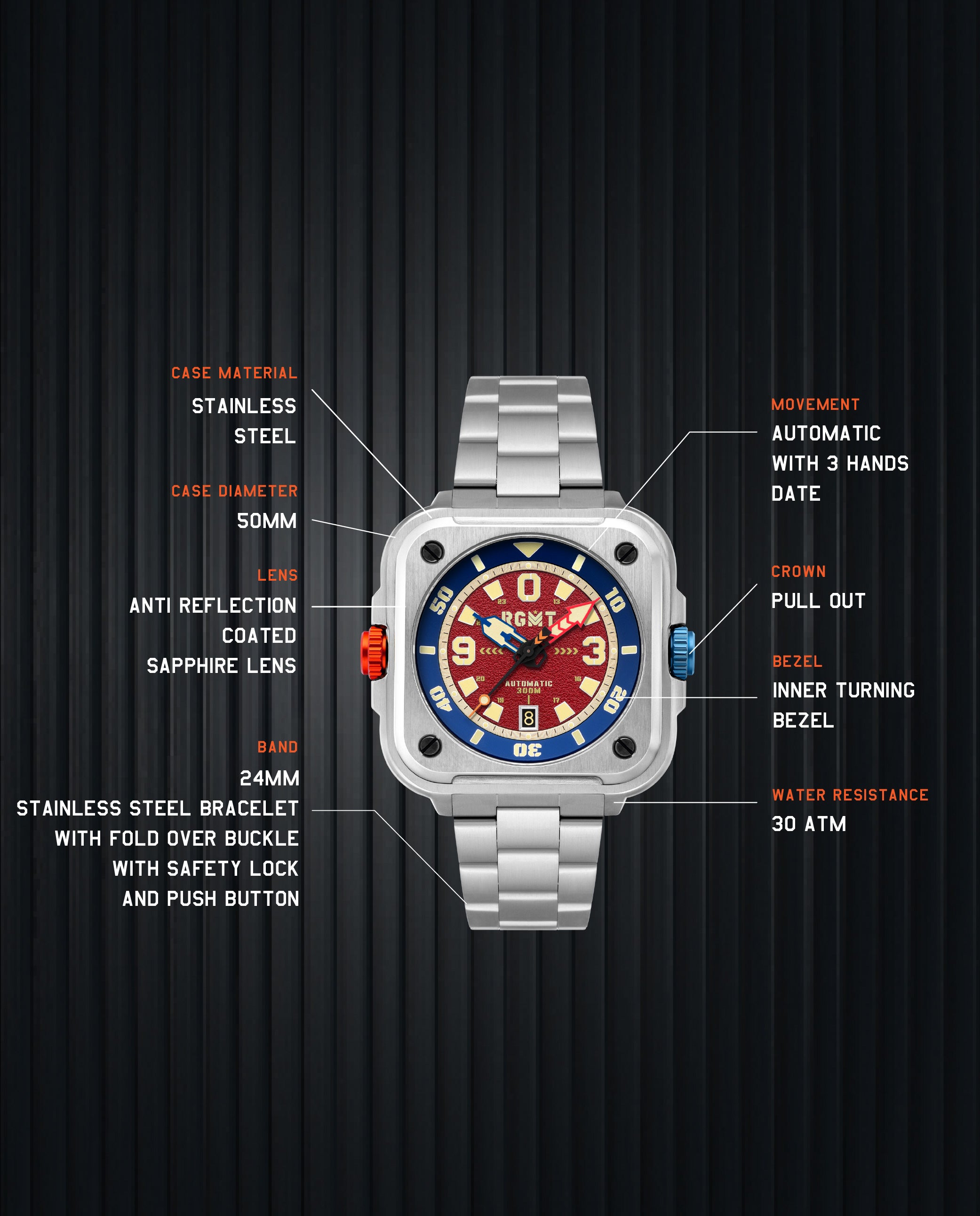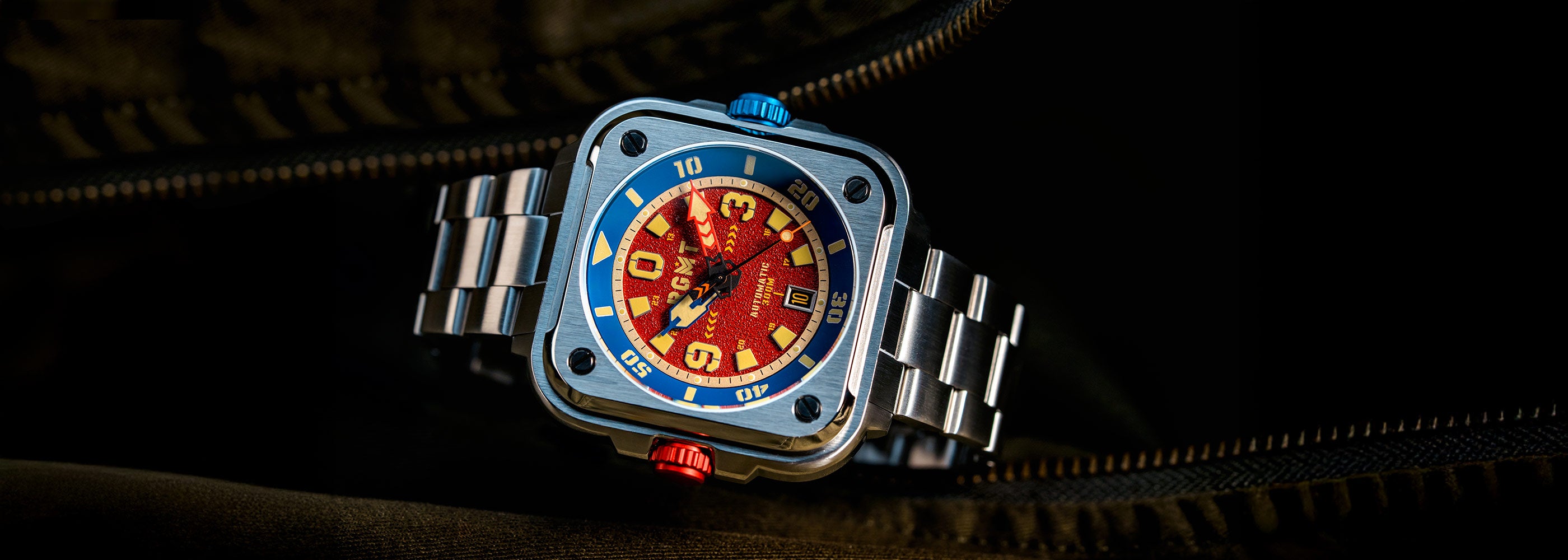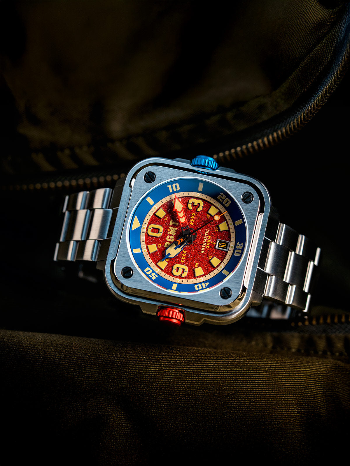 Available in Artillery Red and Command Black, the Pershing Automatic bracelet edition is a watch for those who demand strength and style. Durable, versatile, and bold, it’s ready for any mission—urban or extreme. Step into the next evolution of RGMT square timepieces.