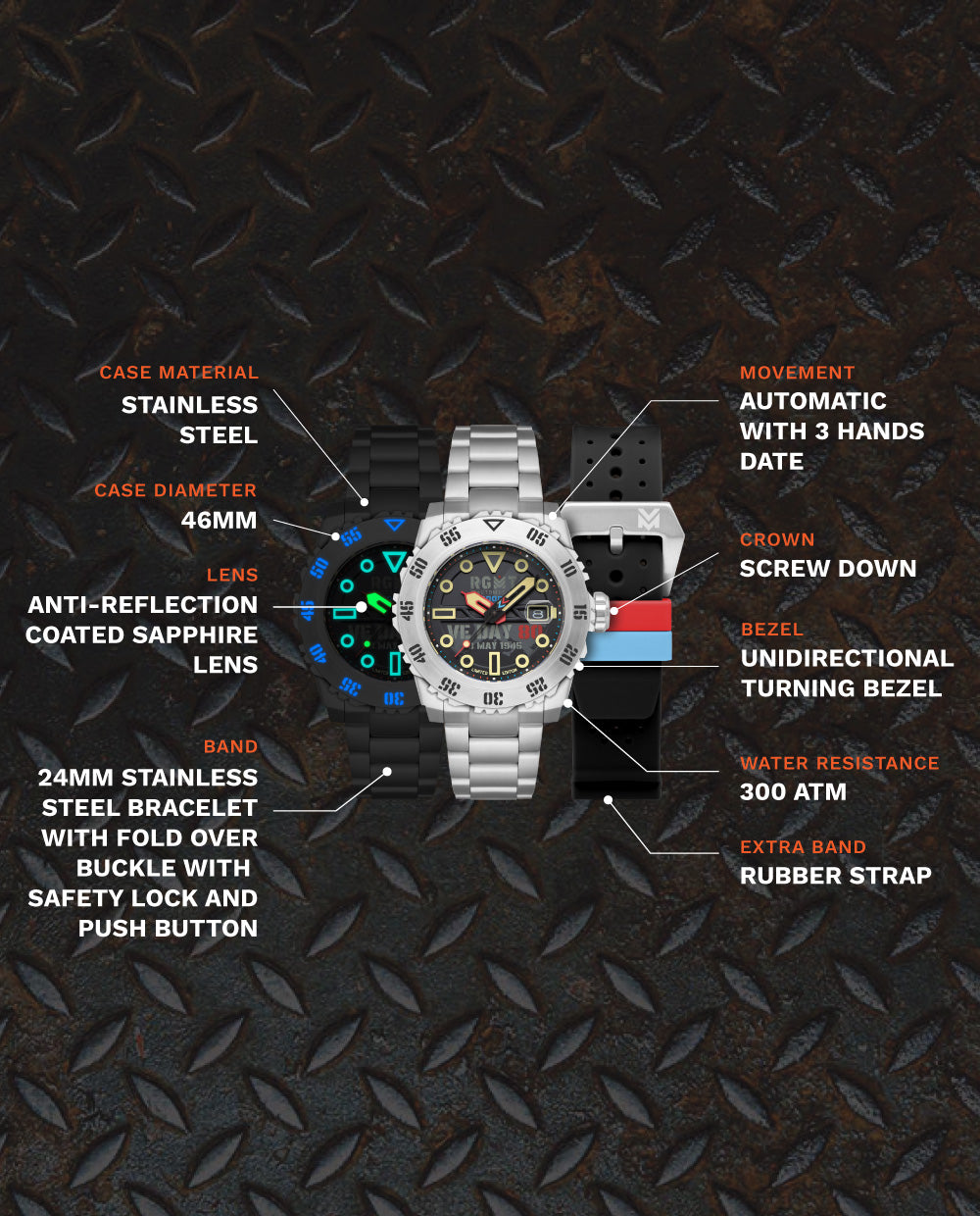 Engineered for Endurance – A 45mm stainless steel dive watch designed for those who brave the depths. Featuring Swiss Super-LumiNova®, 300 ATM water resistance, and a dual-strap option, this watch is a tribute to unwavering resilience.