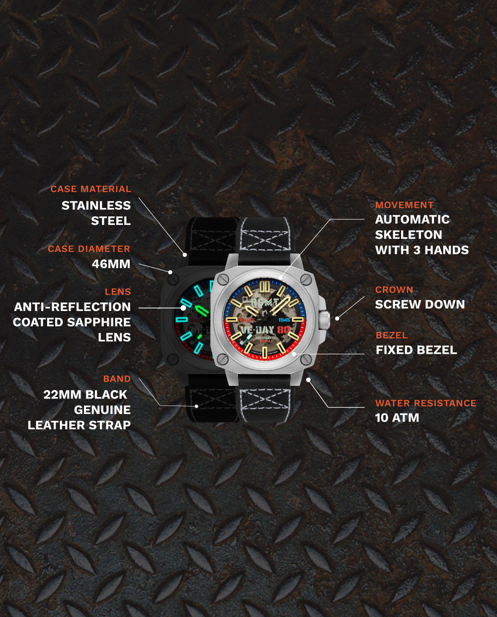 The Spirit of Innovation – A striking 46mm square skeleton timepiece showcasing automatic movement, anti-reflective sapphire glass, and exhibition case back. A watch built for those who push boundaries.