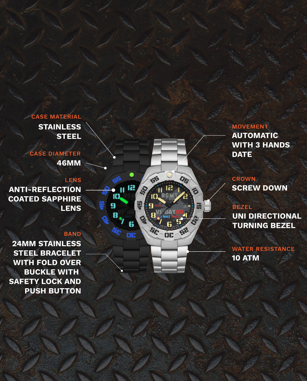 A Tactical Legacy – A rugged 46mm stainless steel field watch with a bi-directional bezel, Japanese luminous details, and a sapphire lens. Built for resilience, this 10 ATM water-resistant timepiece is a bold reminder of strength in the field.
