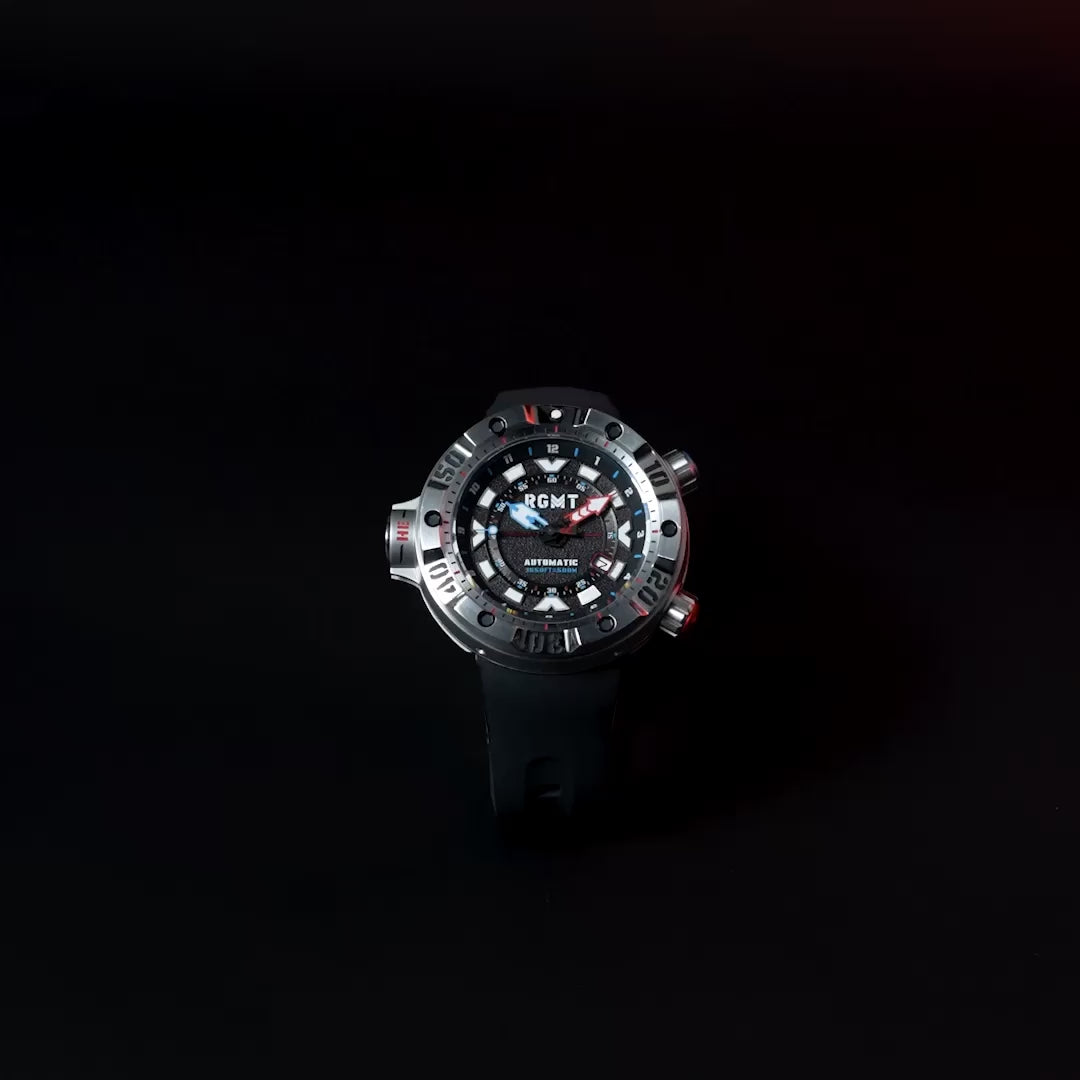 Named after one of the most formidable tools in naval history, the Depth Charge is purpose-built for deep-water dominance with an exceptional 50 ATM water resistance rating, The Depth Charge is also equipped with a helium release function and full luminous application across index, hands, and bezel. It is one of the toughest dive instruments in the RGMT arsenal.