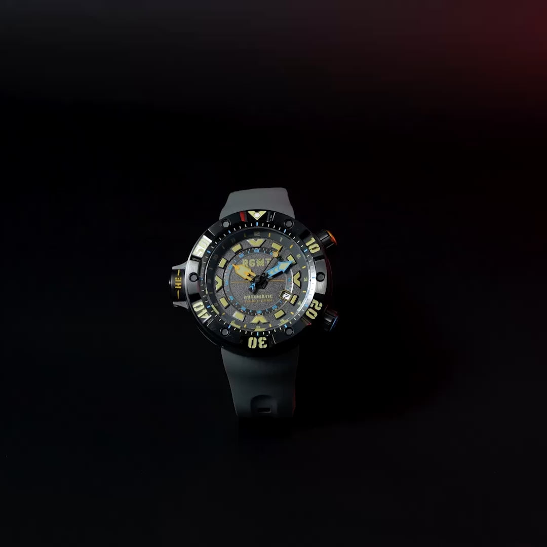Named after one of the most formidable tools in naval history, the Depth Charge is purpose-built for deep-water dominance with an exceptional 50 ATM water resistance rating, The Depth Charge is also equipped with a helium release function and full luminous application across index, hands, and bezel. It is one of the toughest dive instruments in the RGMT arsenal.