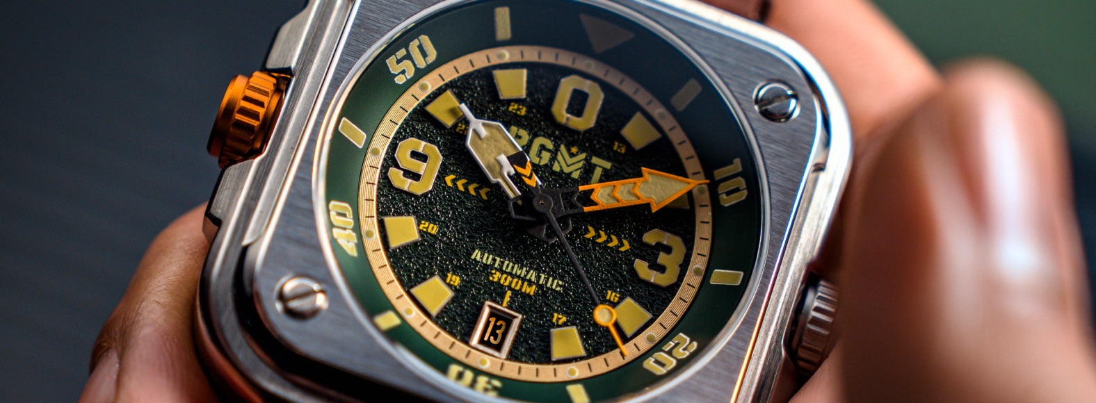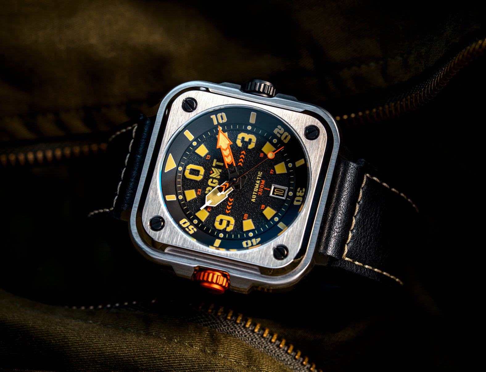 Experience a unique blend of functionality and style with Pershing Automatic. This distinctive square watch also features an exhibition case back, offering a glimpse into the intricate inner workings of the timepiece, while the inner turning bezel adds a touch of sophistication. With an impressive 30 ATM water resistance, this timepiece is a true companion for every mission.
